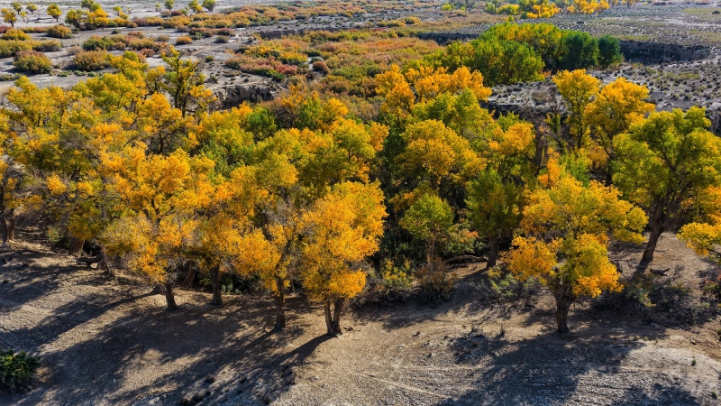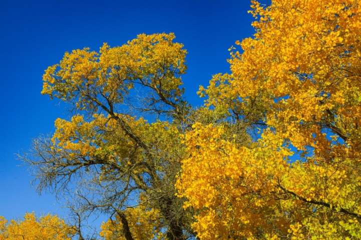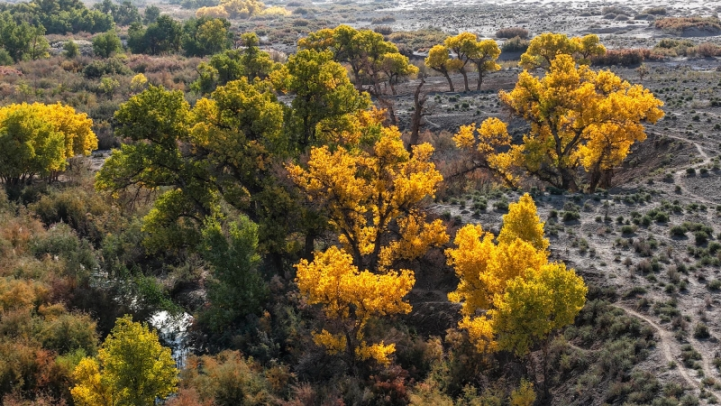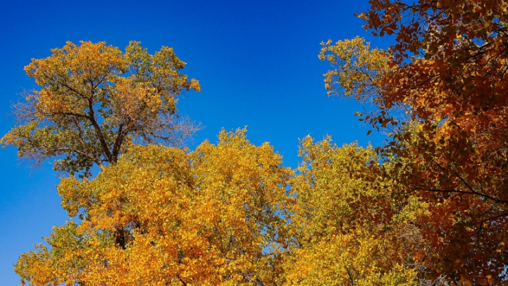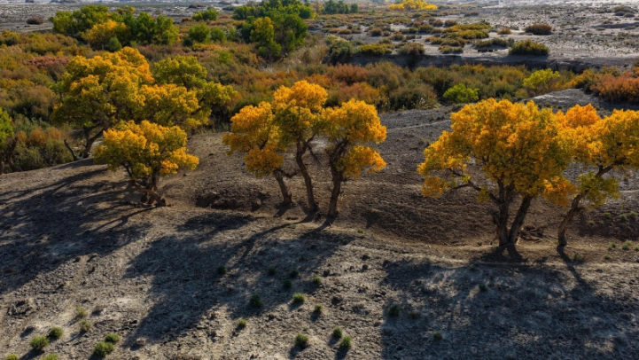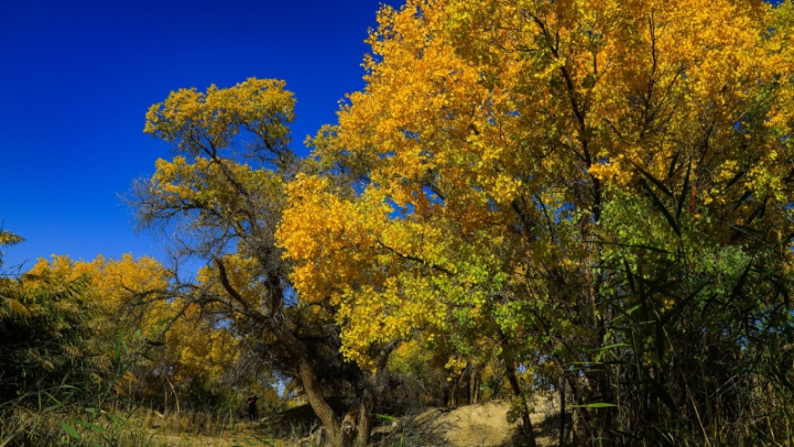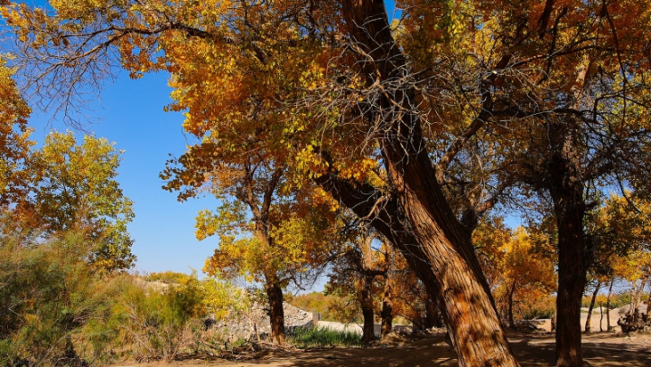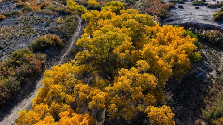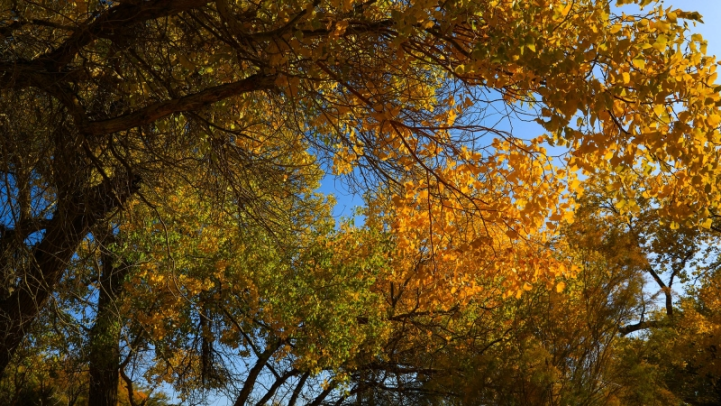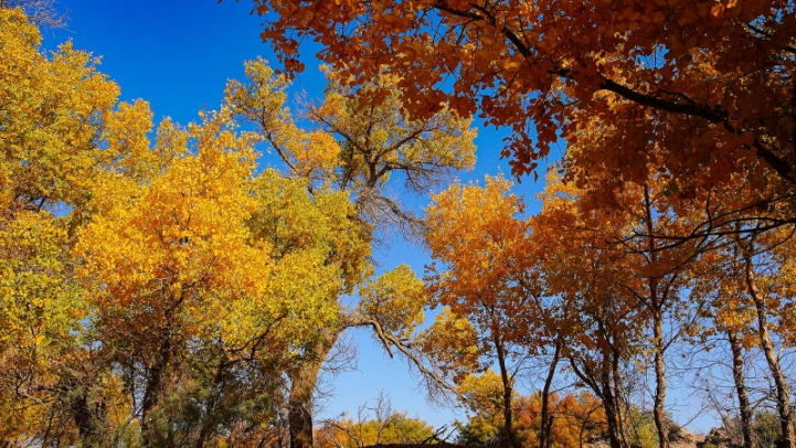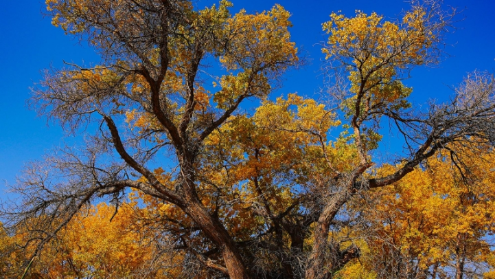 极目远眺,金黄与湛蓝交织,胡杨与天空相映,构成一幅层次分明、色彩浓烈的秋日长卷。据了解,这片胡杨林已静静伫立百年之久。得益于特殊的地理位置与当地持续的保护努力,它至今仍保持着原始而纯粹的自然风貌,成为时光深处一处坚韧而璀璨的风景。
