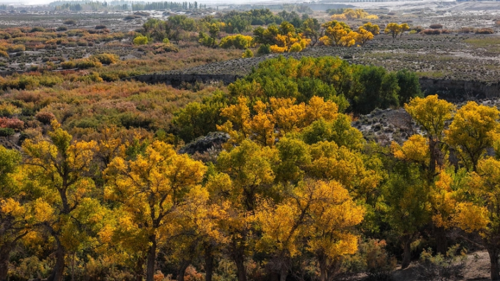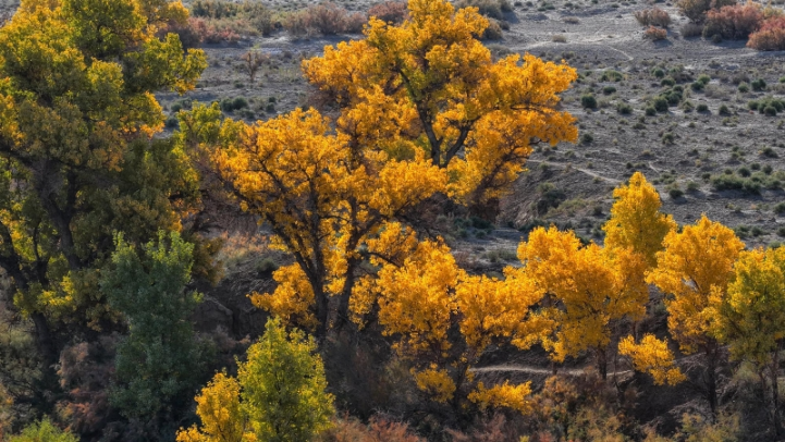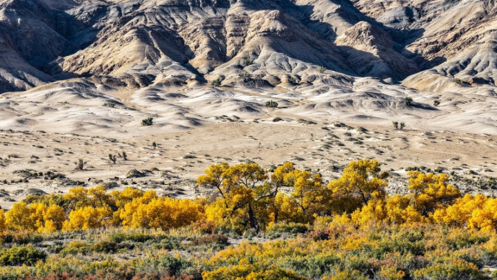 柯尔克孜铁米村山脚下的胡杨林美景。