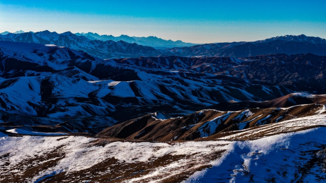 11月18日,位于吐鲁番市托克逊县石泉镇境内的黑山草原在航拍镜头下展现出其独特的冬季风貌。这片海拔3000多米的高山草原,一改夏季的牧区景象,化身为广袤无垠的雪原,与木孜洛克山和远处巍峨的博格达峰共同构成一幅壮丽的冬日画卷。