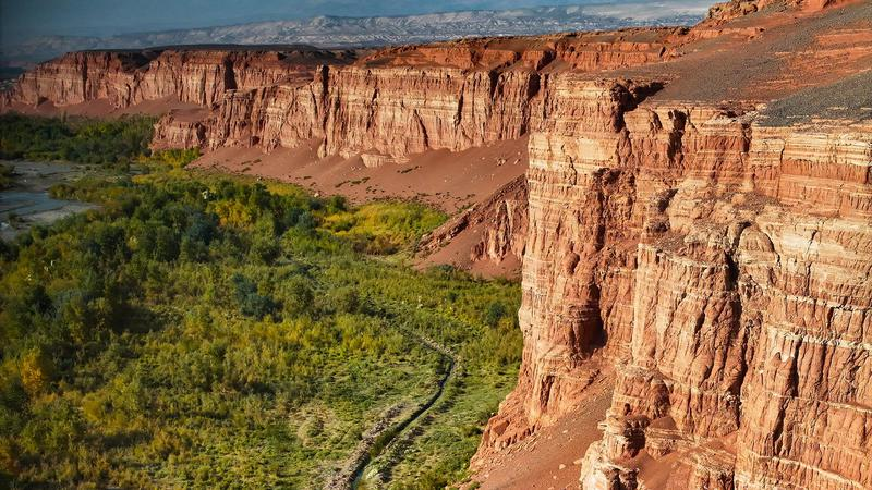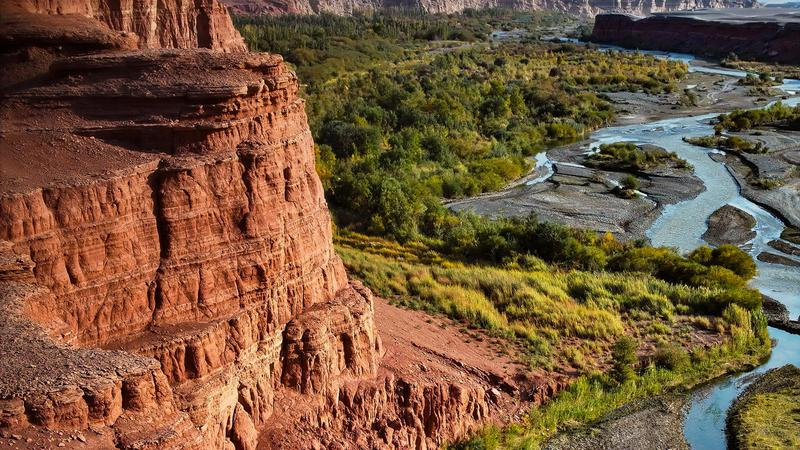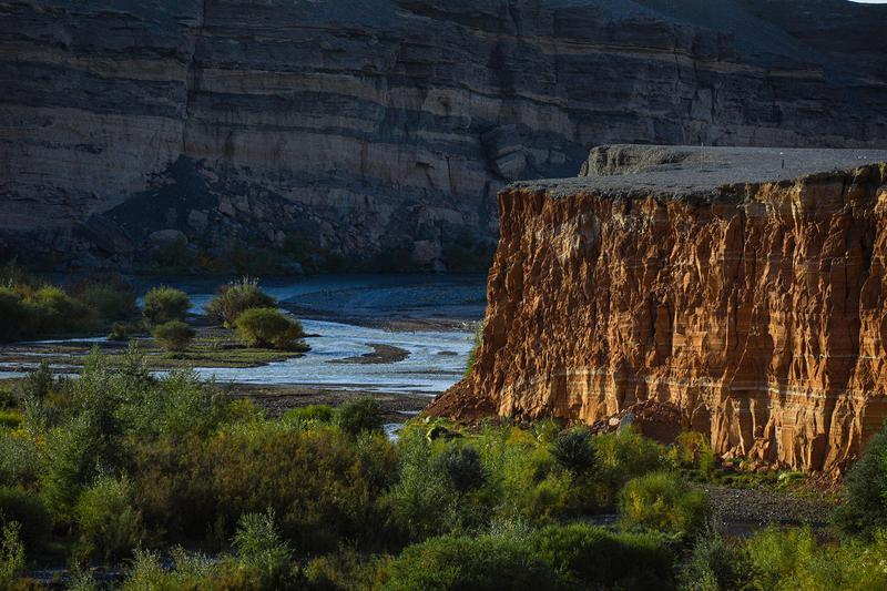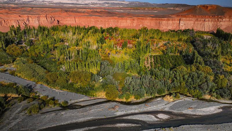 十月的托克逊县天山红河谷,迎来了一年中最富诗意的季节。发源于天山山脉南麓的白杨河在吐鲁番盆地西部切割出一条长约十几公里的美丽河湾,形成了如今色彩斑斓的红河谷景观。空中俯瞰,这片大地调色板尽收眼底:蔚蓝天空下,红色、黑色的山体与青色的河流交错,黄色、白色、红色、绿色的植被点缀其间。河谷内,黑色的第四纪沉积物覆盖着第三纪的红色泥岩,经河水切割形成峡谷,壁陡如削,红黑分明。