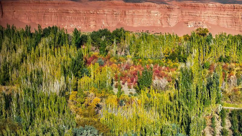 金秋时节,新疆托克逊县天山红河谷披上了五彩斑斓的秋装,红色山体、金色胡杨、绿色植被与蓝色天空交织成一幅绚丽的画卷。