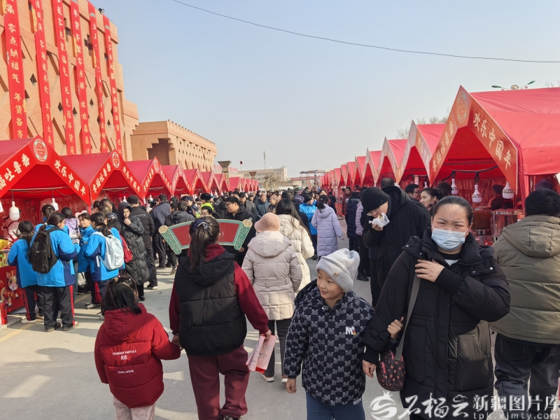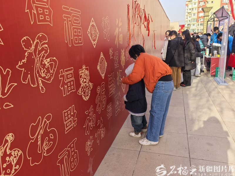 比起热闹的展销区,文化体验区也是人气高涨。长达26米的巨型“福”字板前,居民蒲爱英正握着4岁儿子的手,在红底金边的“福”字上一笔一画描摹。“一大早就带孩子来沾福气,系福带、描福字,就是想让他好好感受新年的氛围。”此时,福字板上1660个不同字体的福字已被描摹大半,字间还留着不少游客手写的新春祝福,字字皆是期许。身后,托克逊县一中初三学生达尼亚尔·木依布力与同学一起,将写有“学业有成、中考顺利”的福带系上树枝。红绸轻扬,载满少年对未来的憧憬。