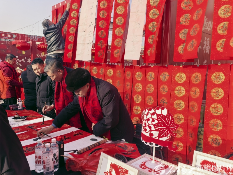 书法区的桌前早已被围得水泄不通,为群众免费写春联的王红军凝神挥毫,手腕转动间,楷、行、草、隶、篆各体的大红福字、新春对联跃然纸上。墨迹未干,已被围观群众欣然接过。“这里的春联款式多、寓意好,我领了好几副,给家里老人也送了一副,贴上对联,欢欢喜喜过春节。”从乌鲁木齐专程赶来逛集的游客刘紫阳高兴地说。