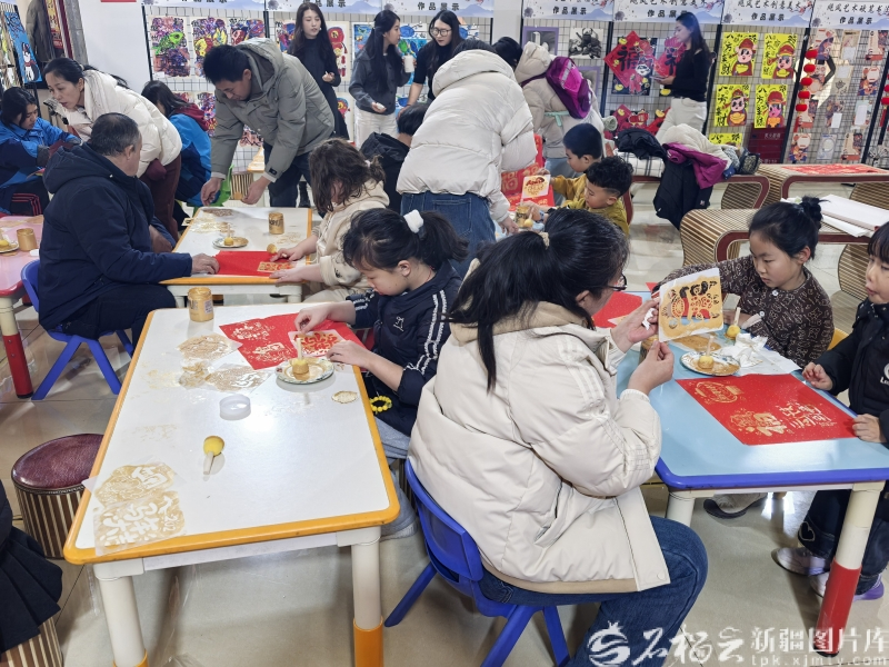 居民带着孩子描摹“福”字,感受浓浓年味。石榴云/新疆日报记者张瑞麟摄