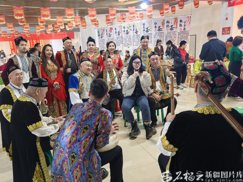 1月31日,托克逊县年货大集上,游客与表演木卡姆的演员合影。石榴云/新疆日报记者张瑞麟摄