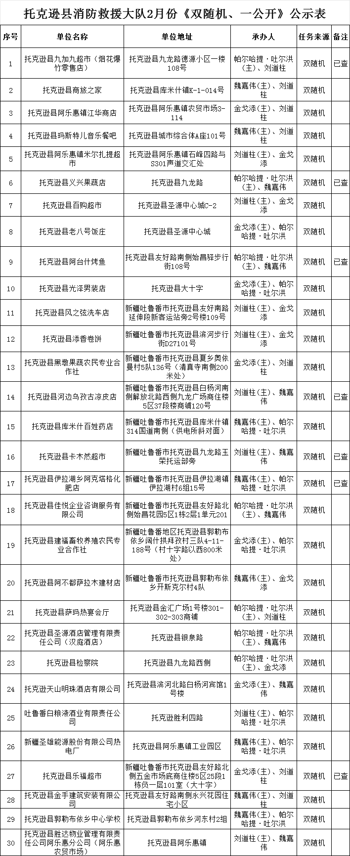 托克逊县消防救援大队2月份《双随机、一公开》公示表