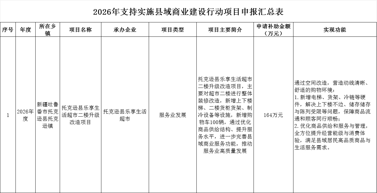 根据《关于组织开展2026年支持实施县域商业建设行动项目申报工作的通知》文件精神,托克逊县商务和工业信息化局组织开展了2026年县域商业体系项目遴选工作,本次共申报了3个项目,遵循公平、公开、公正的原则,经审核评审,仅托克逊县乐享生活超市《托克逊县乐享生活超市二楼升级改造项目》符合申报要求,拟入选予以公示。公示时间为5个工作日,自2026年3月18日起至2026年3月25日止,如有异议,请与托克逊县商务和工业信息化局联系。
