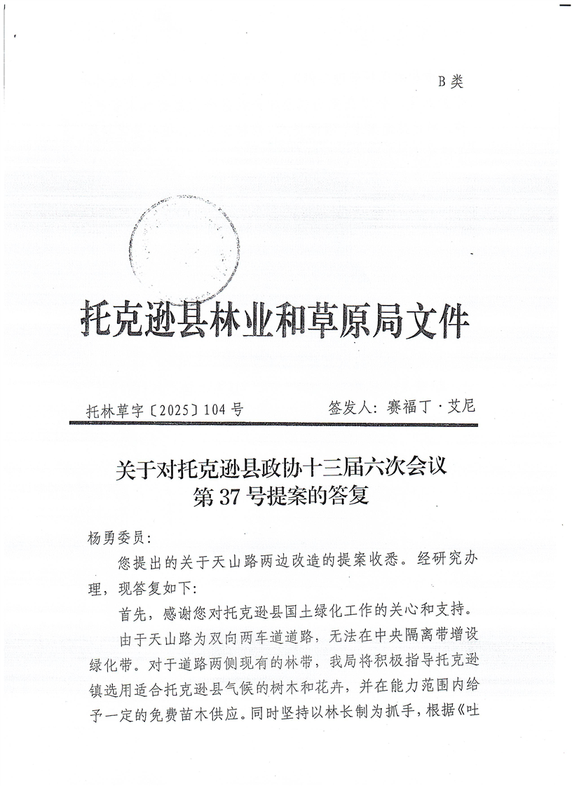 2025年托克逊县第十三届政治协商会议第六次会议37号提案答复情况