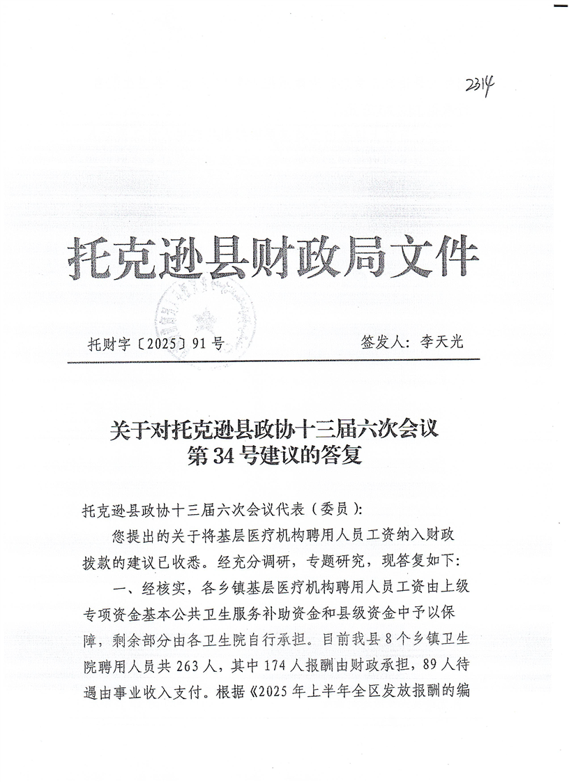 2025年托克逊县第十三届政治协商会议第六次会议34号提案答复情况
