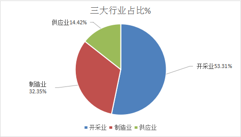 14个行业中9个行业保持增长,增长面为65%。其中,开采业、制造业、供应业等三大行业增加值分别同比增长4.6%、8.1%、5%,分别占规模以上工业增加值的53.3%、32.4%、14.4%。