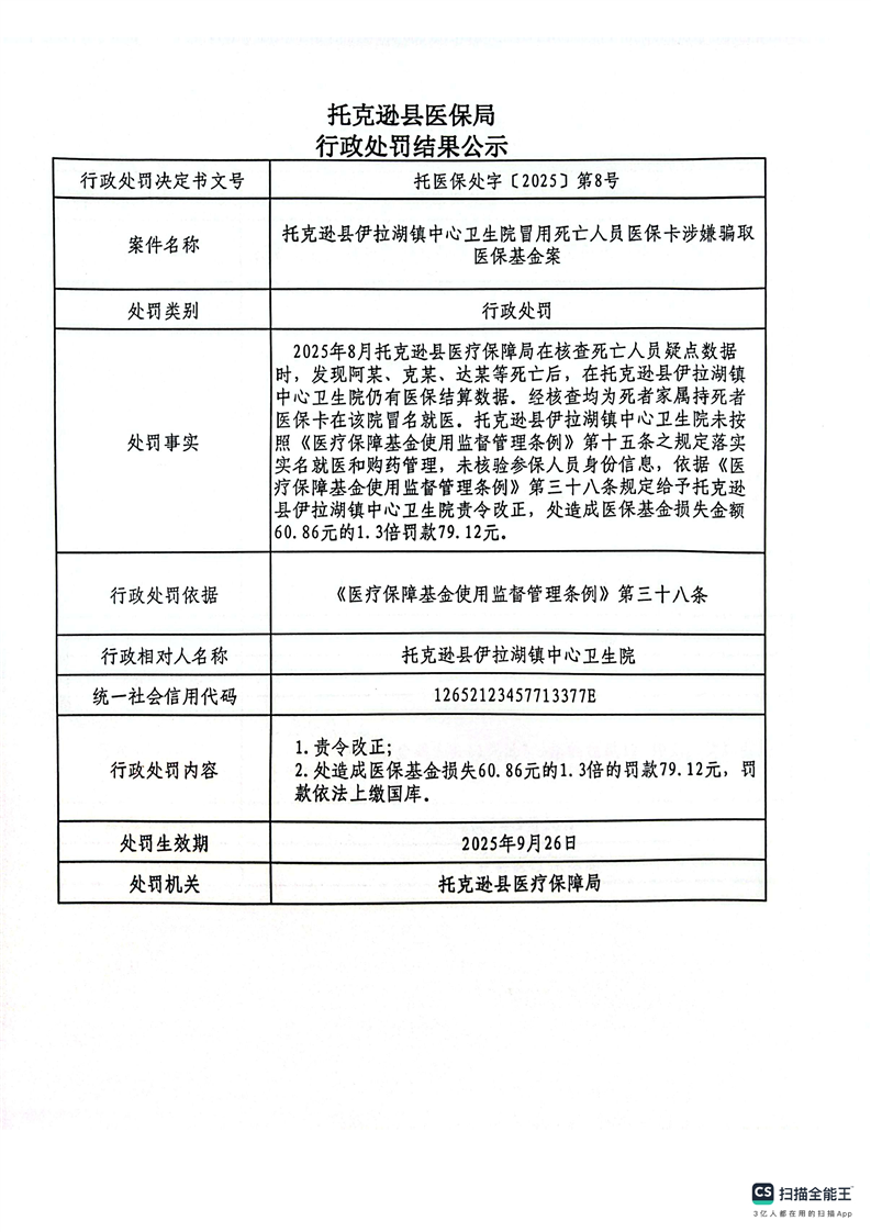 托克逊县伊拉湖镇中心卫生院冒用死亡人员医保卡涉嫌骗取医保基金案