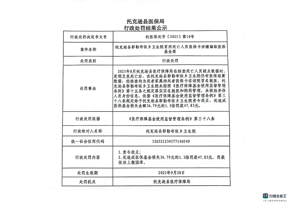 托克逊县郭勒布依乡卫生院冒用死亡人员医保卡涉嫌骗取医保基金案