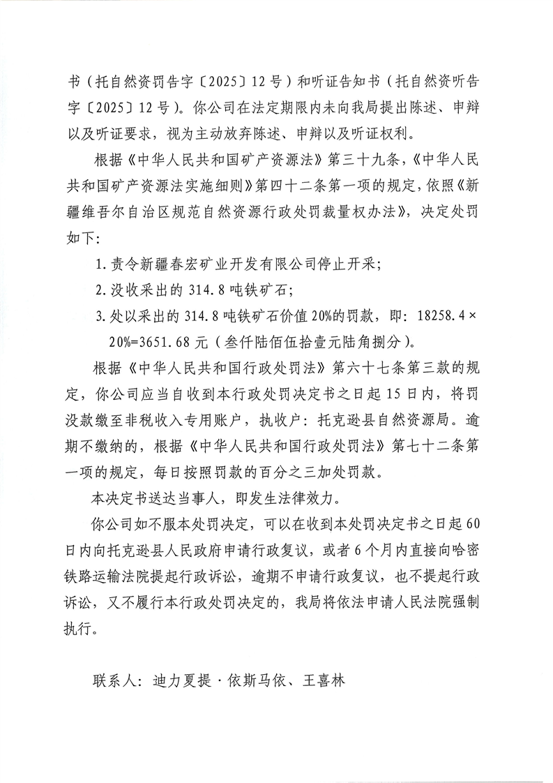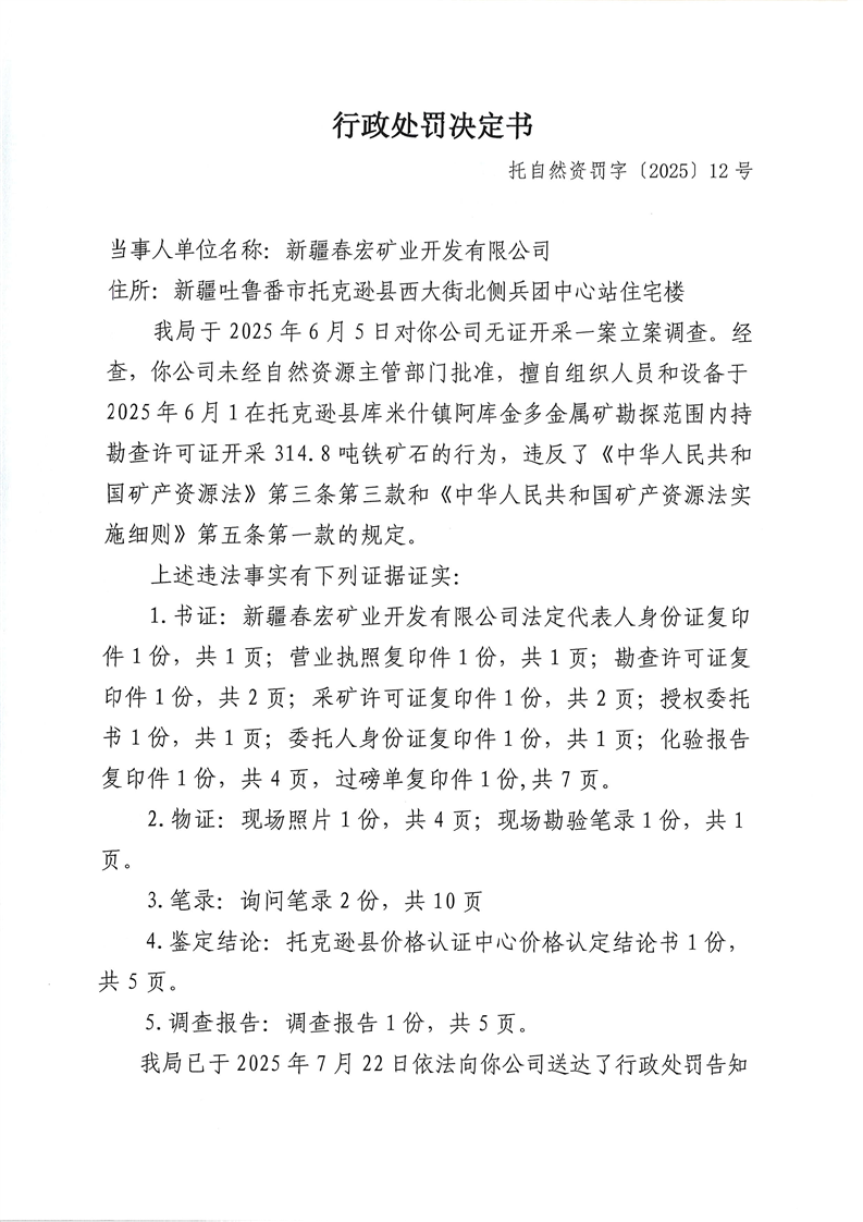新疆春宏矿业开发有限公司无证开采案行政处罚决定书