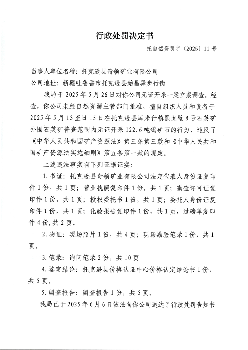 托克逊县奇领矿业有限公司无证开采案行政处罚决定书