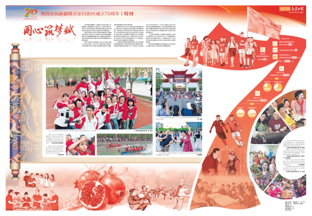 苍穹垂耀,西陲焕光。五星辉映,七秩芳华正盛。天山巍巍为证,雪域皎皎作凭。各族儿女,七十载手手相牵、心心相印,共垦荒原成沃野,同辟戈壁化绿洲。帕米尔千峰竞秀,见证同心伟力;塔里木万壑奔涛,长吟筑梦壮歌。