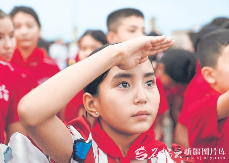 7月31日,策勒县策勒镇中心小学学生帕提曼罕·排日海提第一次在天安门广场观看升国旗仪式。当国旗升起,她抑制不住内心的激动,眼泪夺眶而出。 新华社发(张利民摄)