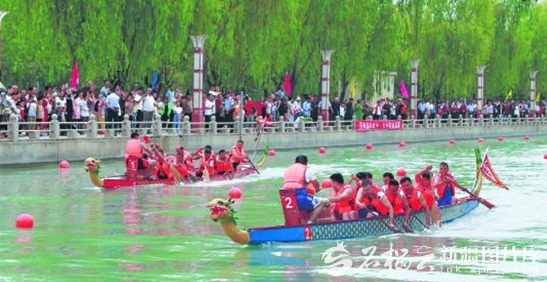5月31日,龙舟选手在阿瓦提县刀郎河景观带河面上竞逐。当日,阿瓦提县举办第一届“石榴籽·铸牢杯”端午节赛龙舟活动,共30支队伍参赛。 包良廷摄