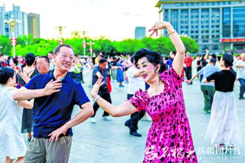 7月3日傍晚,乌鲁木齐市南湖市民广场热闹如常,各族市民与游客伴着欢快的音乐翩翩起舞,其乐融融。孙振嵩摄