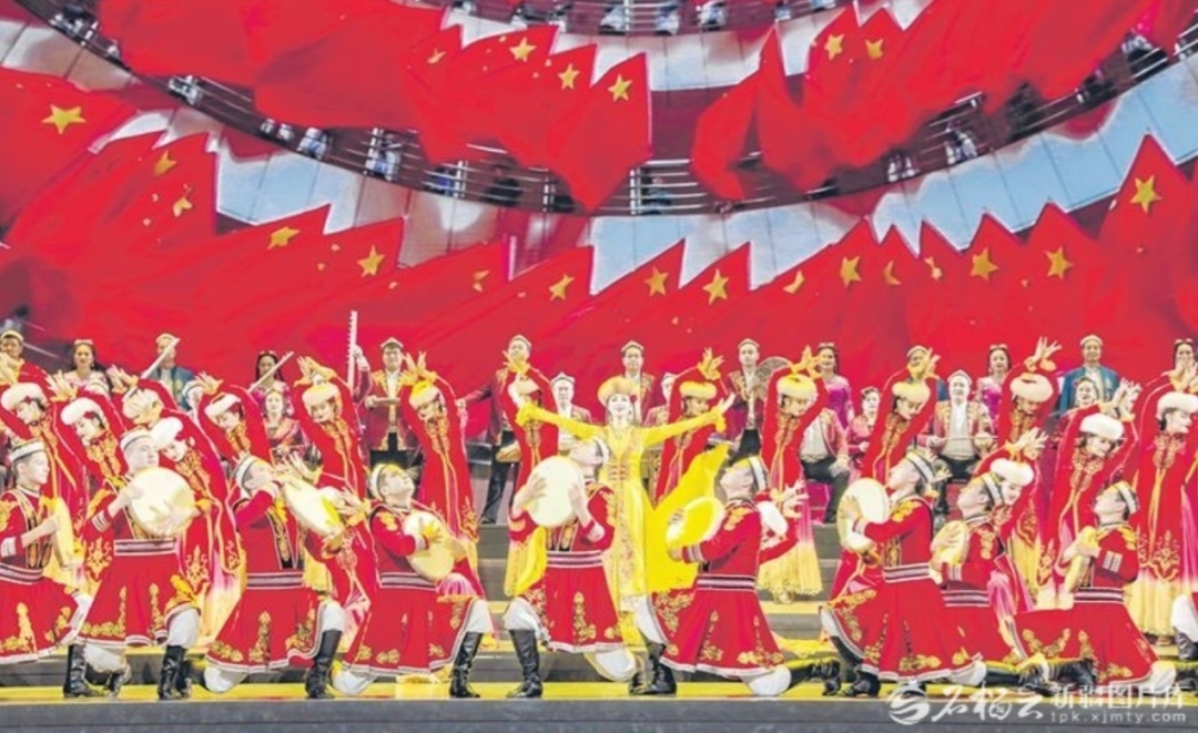从1955年10月1日各族群众欢庆自治区成立,到库尔班·吐鲁木讲述新生活的喜悦;从青年扎根边疆开荒拓土,到改革开放城乡焕发活力;再到如今天山南北社区乡村里,各族群众亲如一家、互助共融……一个个历史片段在舞台上鲜活呈现。