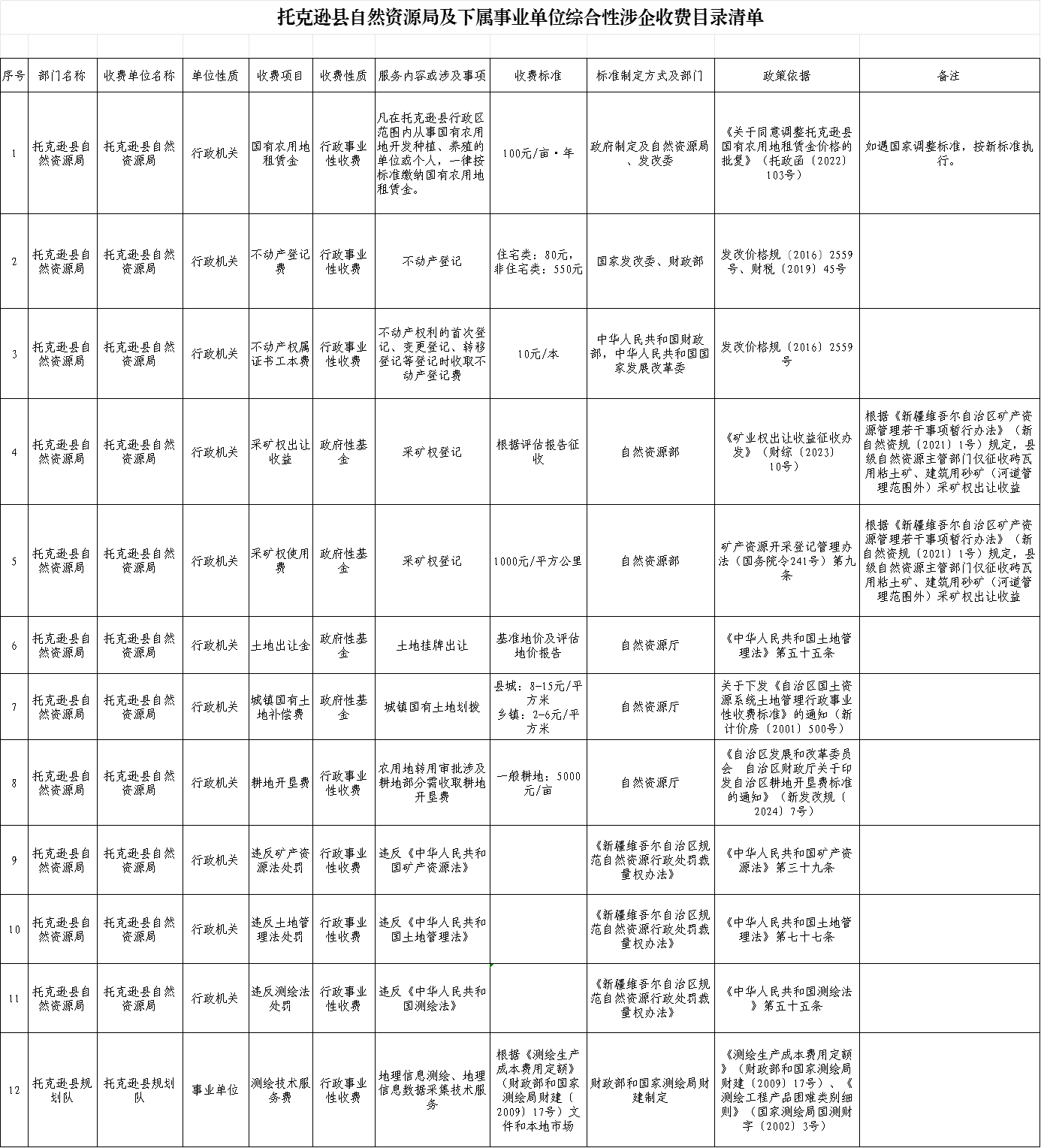 托克逊县自然资源局及下属事业单位综合性涉企收费目录清单