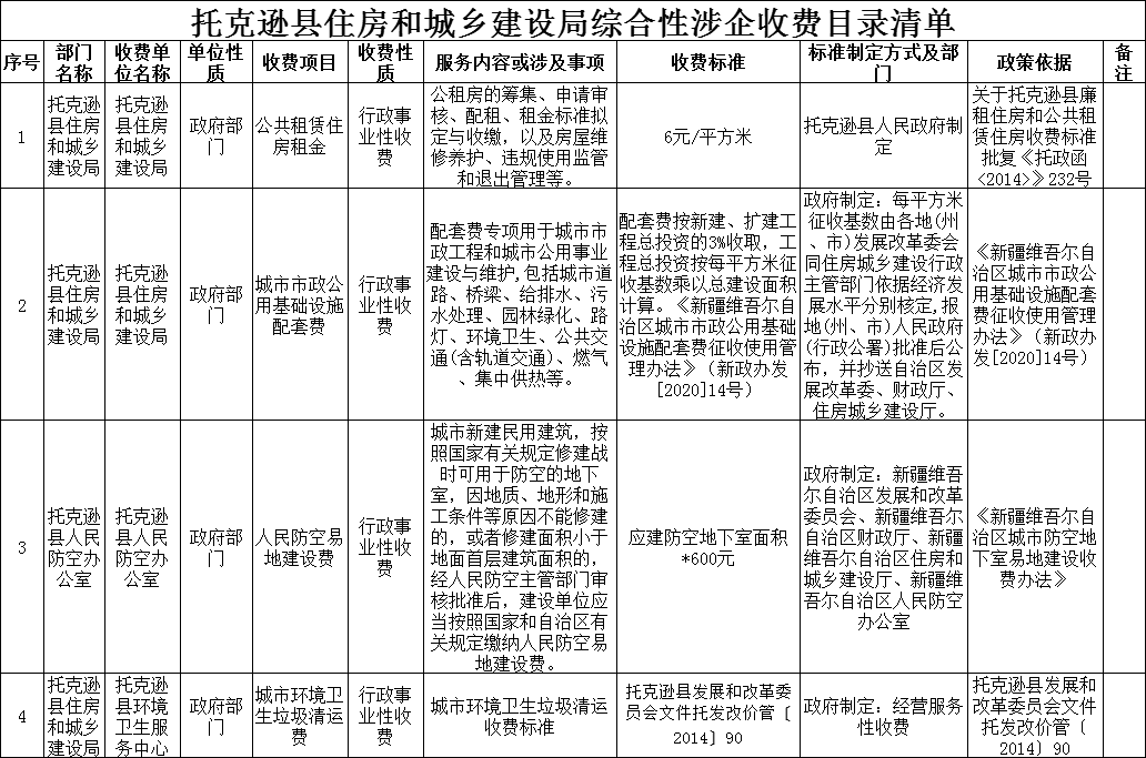 托克逊县住房和城乡建设局综合性涉企收费目录清单