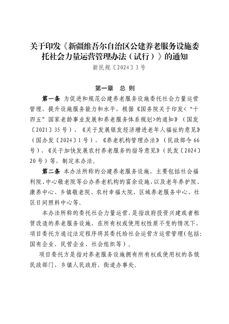 关于印发《新疆维吾尔自治区公建养老服务设施委托社会力量运营管理办法(试行)》的通知