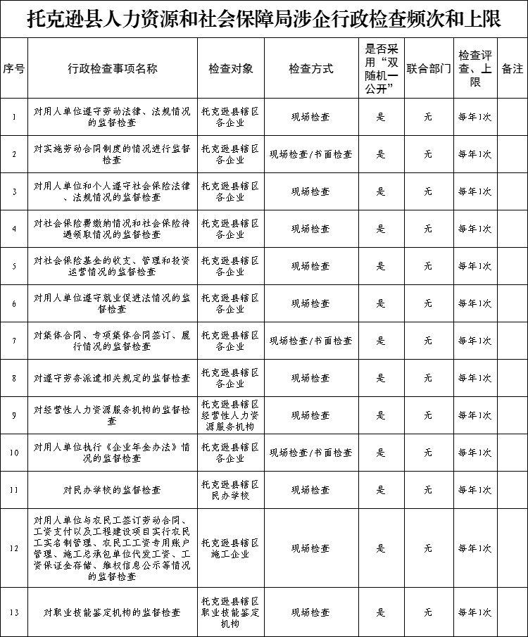 托克逊县人力资源和社会保障局涉企行政检查频次和上限