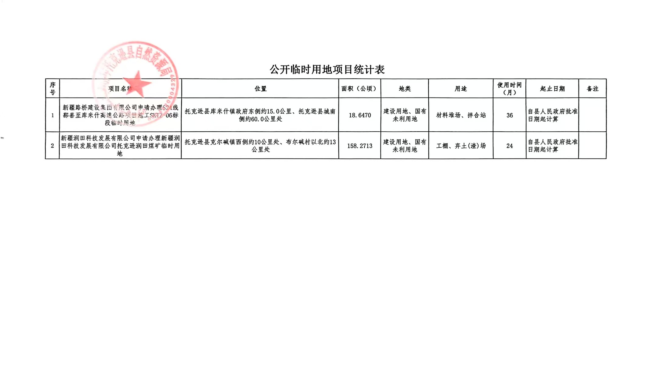 关于新疆路桥建设集团有限公司等2家企业临时用地的公示