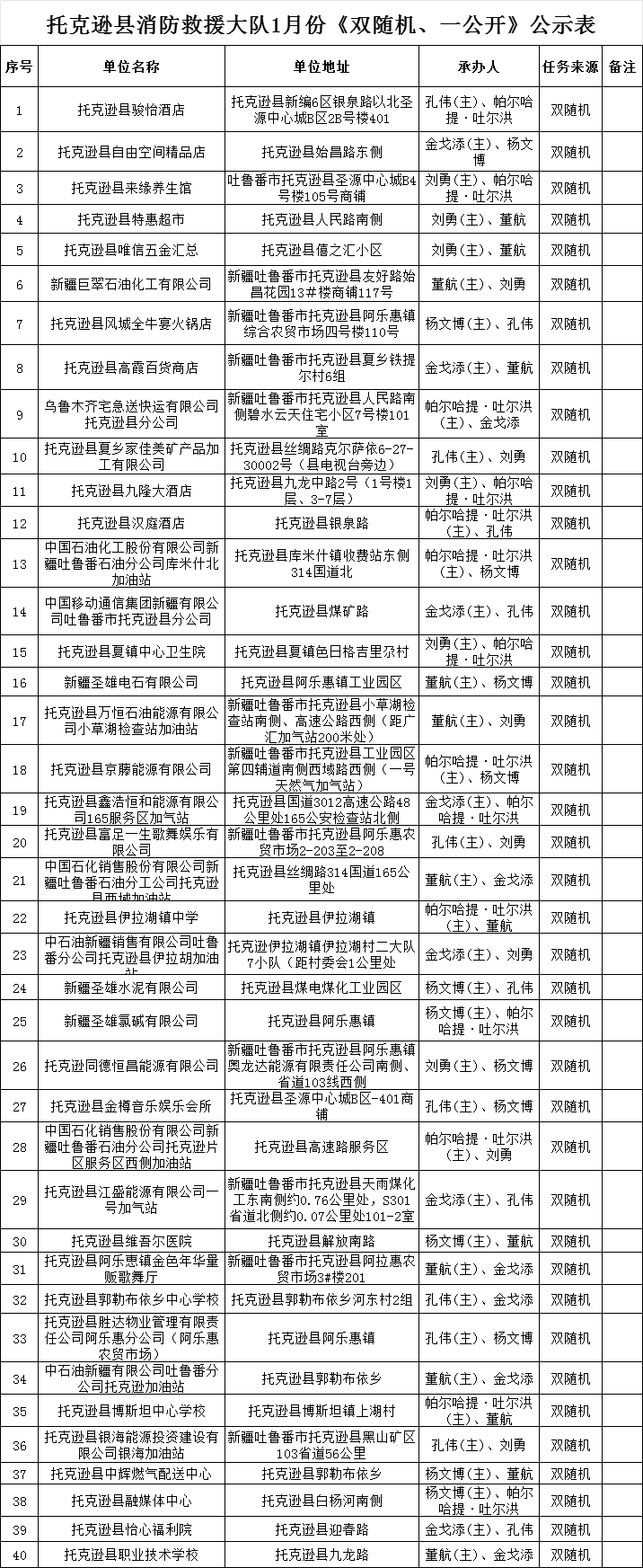 托克逊县消防救援大队1月份《双随机、一公开》公示表