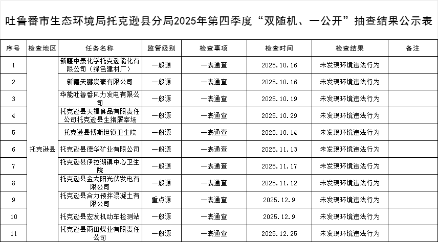 吐鲁番市生态环境局托克逊县分局2025年第四季度“双随机、一公开”抽查结果公示表