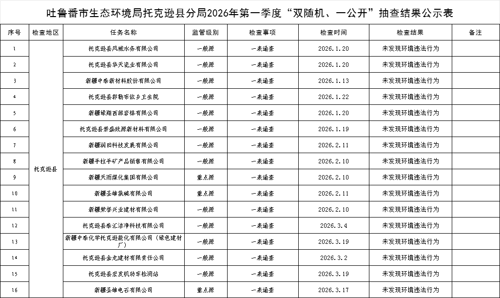 吐鲁番市生态环境局托克逊县分局2026年第一季度“双随机、一公开”抽查结果公示表